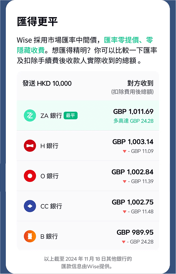 Wise 是一所在英國上市的 FinTech 公司,全球有超過 1,300 萬名用戶,受英國的金融行為監管局及香港海關等各個機構監管,加上 ZA Bank 為香港金融管理局持牌銀行,你即管放心匯款。