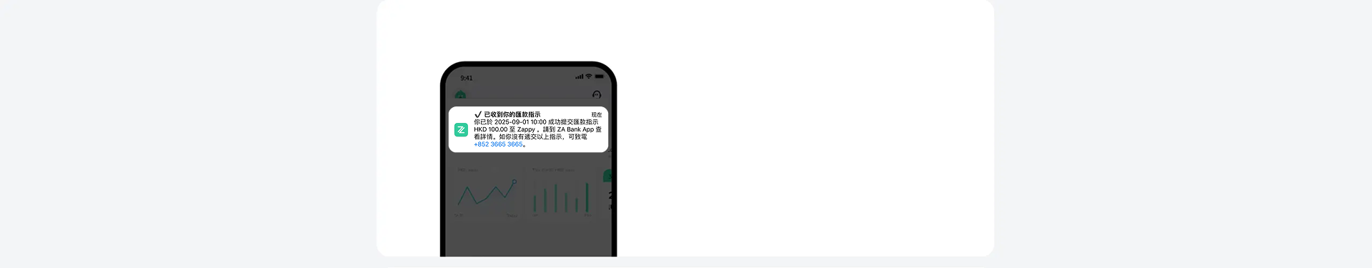 匯款成功提交及發送後,ZA Remit 都會分別通知你,讓你清楚掌握匯款各個階段。