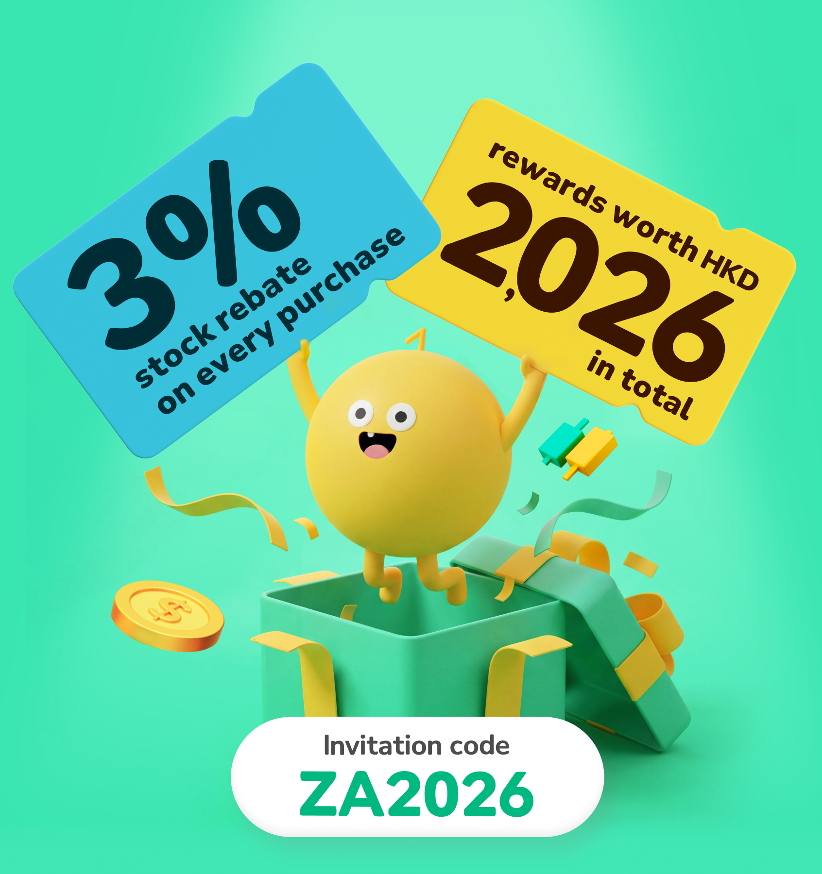 1.“StockBack x ZA Card” Promotion: The promotion period is from 3 November 2025 to 30 June 2026, both dates inclusive. Each eligible transaction with the transaction amount of not less than HKD 10 by participants who use ZA Card with the savings account balance to spend during the promotion period will be entitled to one (1) StockBack Chance, and will not be entitled to any rewards of other ZA Card promotions that involve ZA Coin. All StockBack Chances will be valid for 48 hours. For each StockBack Chance, participants can select one of the six (6) stocks on the StockBack machine on the campaign page as their stock rebate (“StockBack Rewards”), and the amount of reward will be 1% of the transaction amount or a higher rebate amount under limited-time promotions launched by ZA Bank from time to time. Participants must hold a valid investment account and have activated the corresponding investment trading services within 90 calendar days after selecting the StockBack Rewards in order to obtain ownership of and receive the rewards. Otherwise, the rewards will be forfeited and deemed as waived, and ZA Bank will not reissue the rewards. “StockBack x ZA Card”Promotion is subject to its
