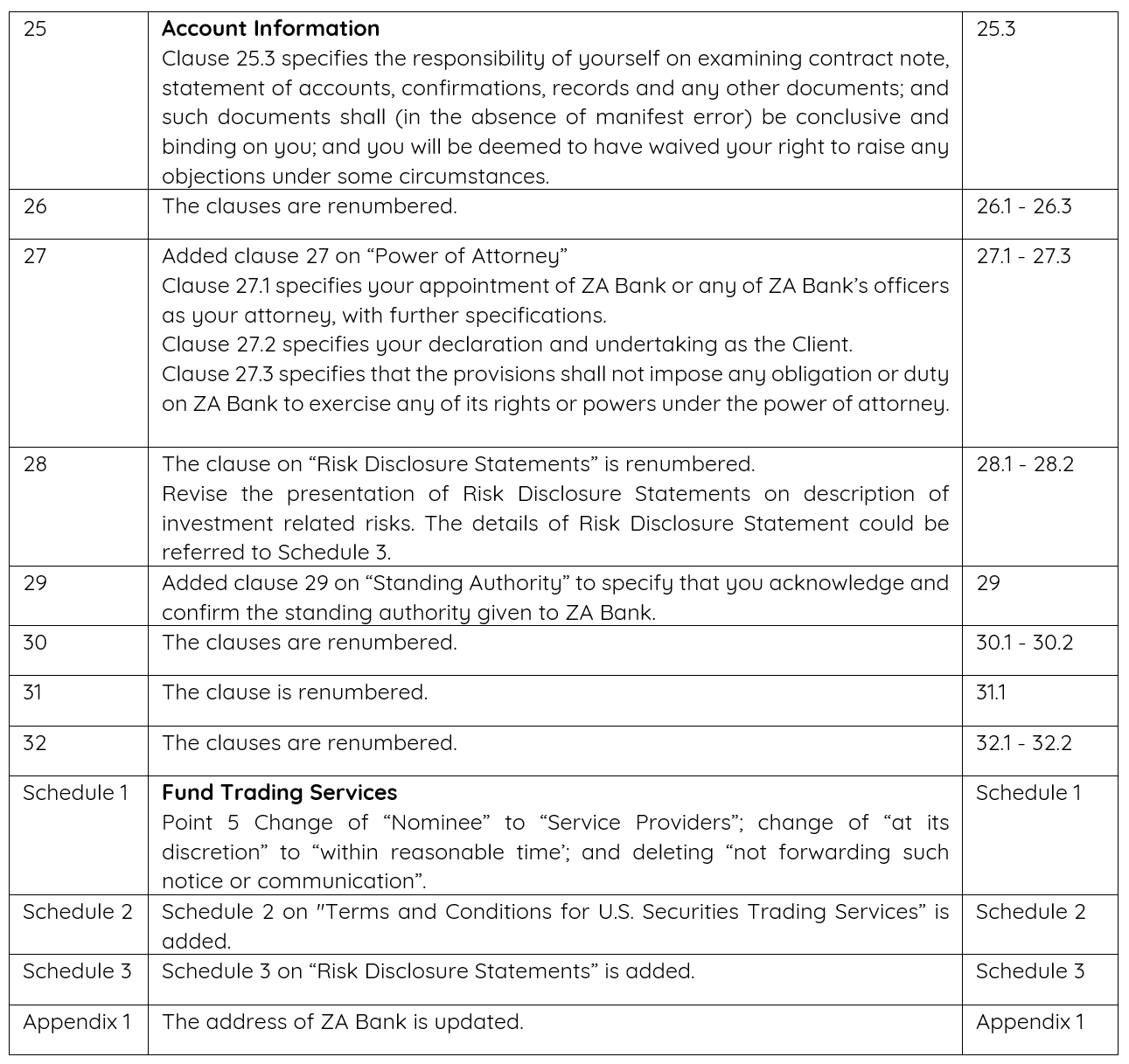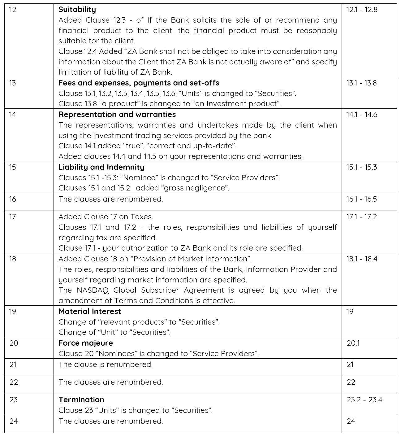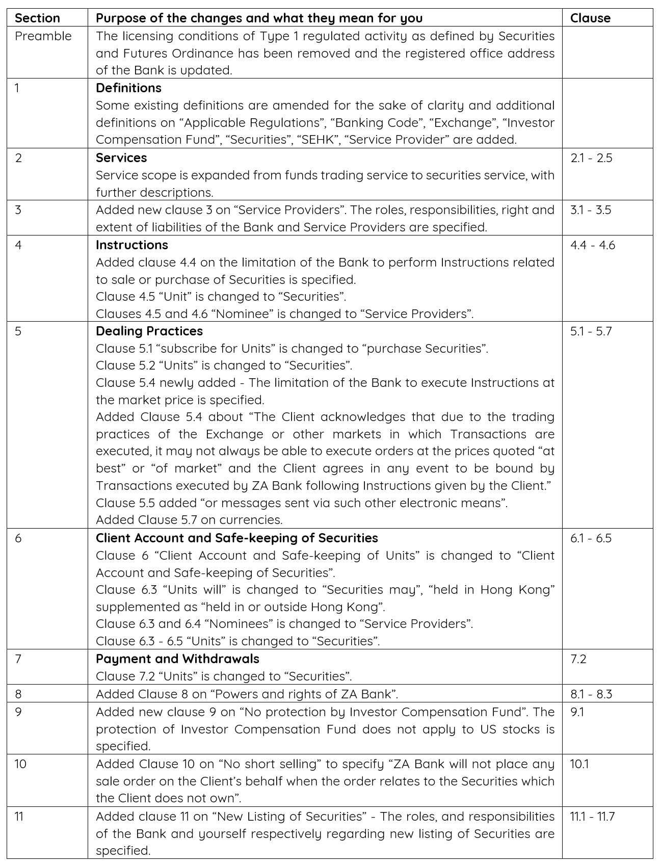 ZA Bank Limited (“We” or “ZA Bank”) is updating our “Terms and Conditions for Investment Services” (“Revised Terms”), which will take effect from 19 February 2024. We know this may sound boring, but to better protect your interests, please bear with us and take a few minutes to read through this notice carefully.