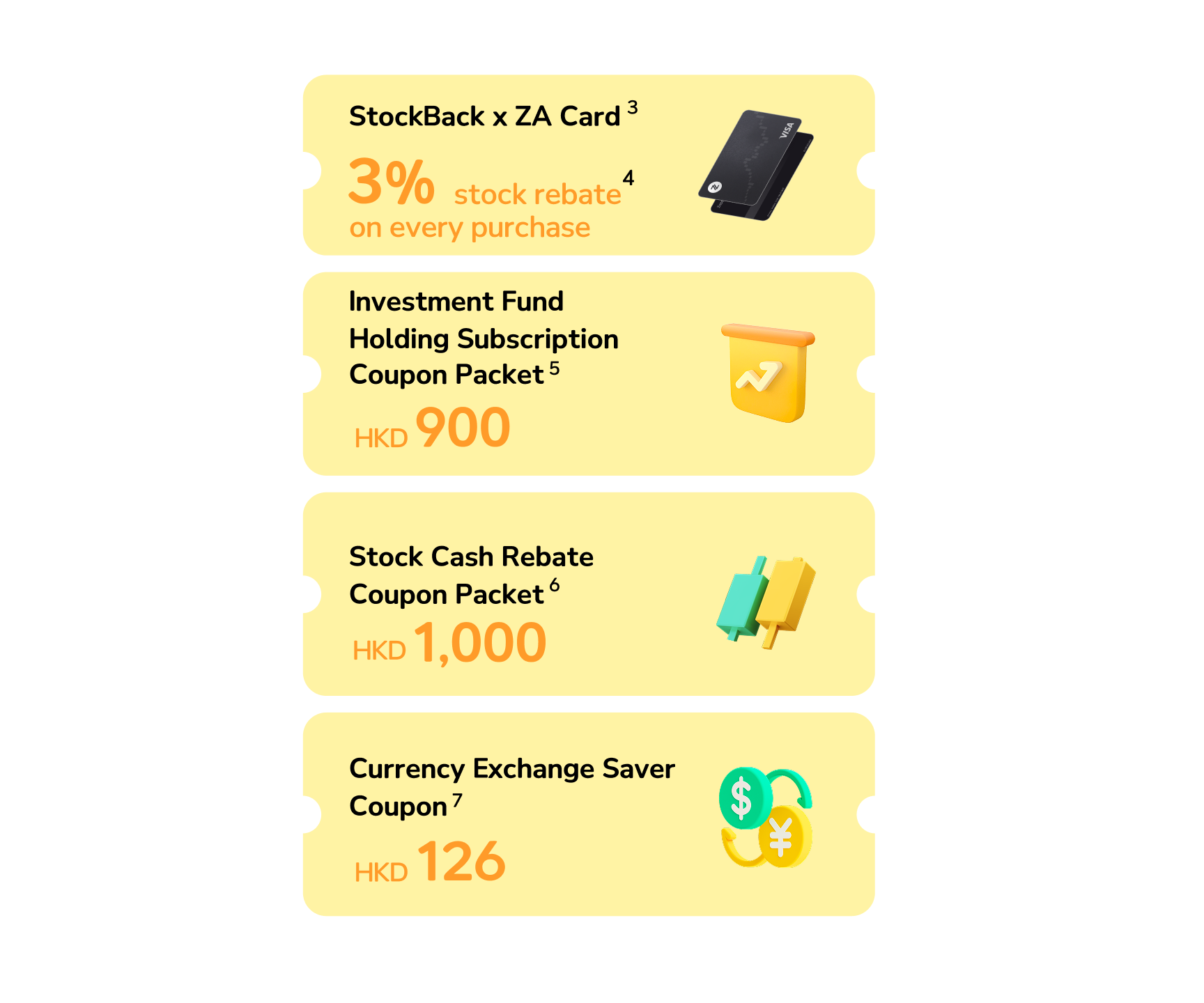 3. "StockBack x ZA Card" Promotion: The promotion period is from 3 November 2025 to 30 June 2026, both dates inclusive. Each eligible transaction with the transaction amount of not less than HKD 10 by participants who use ZA Card with the savings account balance to spend during the promotion period will be entitled to one (1) StockBack Chance, and will not be entitled to any rewards of other ZA Card promotions that involve ZA Coin. All StockBack Chances will be valid for 48 hours. For each StockBack Chance, participants can select one of the six (6) stocks on the StockBack machine on the campaign page as their stock rebate ("StockBack Rewards"), and the amount of reward will be 1% of the transaction amount or a higher rebate amount under limited-time promotions launched by ZA Bank from time to time. Participants must hold a valid investment account and have activated the corresponding investment trading services within 90 calendar days after selecting the StockBack Rewards in order to obtain ownership of and receive the rewards. Otherwise, the rewards will be forfeited and deemed as waived, and ZA Bank will not reissue the rewards. "StockBack x ZA Card" Promotion is subject to its