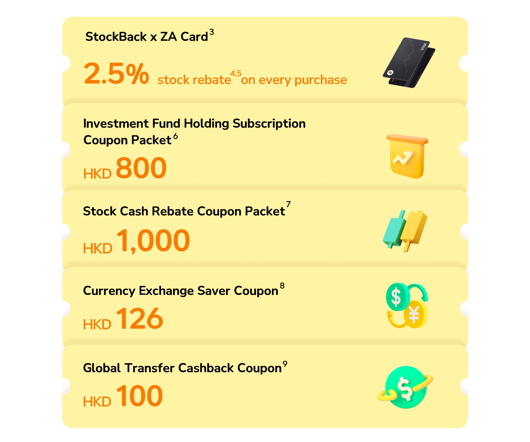 5. StockBack × ZA Card New Member Welcome Gift Promotion: The promotion is from 13 Feb 2026 to 30 Jun 2026, both dates inclusive. During the promotion period, new customers, who have never opened any bank account with ZA Bank or held any product or service with ZA Bank (including, but not limited to, deposit accounts and loan accounts) shall be entitled to an extra 1% stock rebate on the first HKD 10,000 of eligible transactions made with the ZA Card within 30 calendar days after successful account opening (the day of account opening shall be deemed the first day), provided that such customers select the “StockBack x ZA Card”. This offer can be used in conjunction with the limited-time offer of 1.5% stock rebate, which the new customers can get up to 2.5% stock rebate. StockBack × ZA Card New Member Welcome Gift Promotion is subject to its