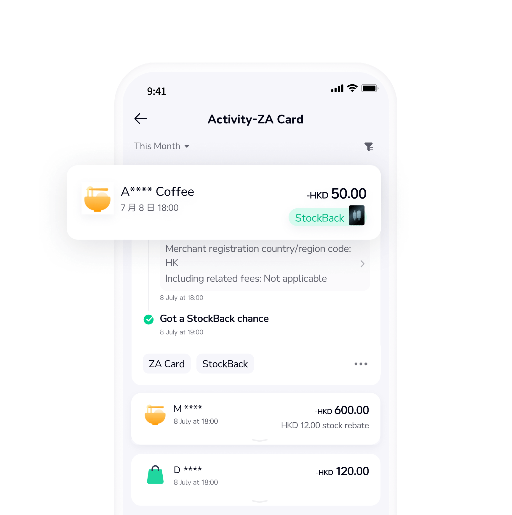 2. “StockBack x ZA Card” Limited-time Promotion: The promotion is from 3 November 2025 to 31 January 2026, both dates inclusive. During the promotion period, the first 50,000 participants, who switch to the “StockBack x ZA Card” rebate program, make eligible transactions (excluding transactions made through Alipay and WeChat Pay) at the designated merchant categories within the specified period will receive a StockBack Rewards equivalent to 50% of the transaction amount (“Special Rebate”). During the promotion period, each eligible participant may receive a maximum amount of Special Rebate of HKD 200. In the event that the eligible participant concurrently meets the eligibility criteria for two or more promotions related to StockBack Rewards, the rebate the eligible participant receives will be the higher one. “StockBack x ZA Card”Limited-time Promotion is subject to its