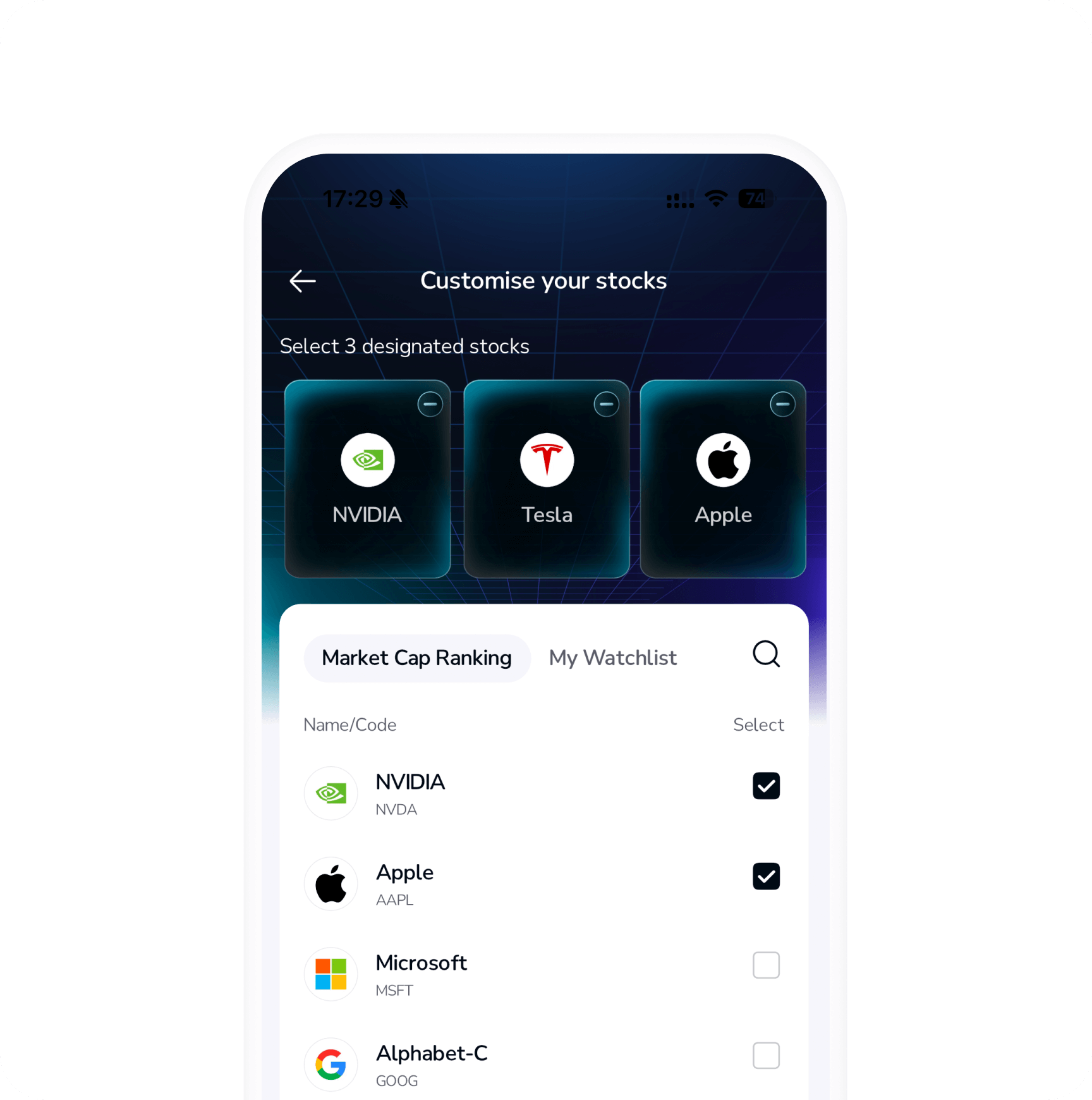4. Participants can select one of the six (6) stocks on the StockBack machine (3 on the top row and 3 on the bottom row) as their StockBack Rewards in the promotion, and participants may select or change the 3 stocks displayed on the machine as the designated stocks. The stocks that participants can choose are US stocks ranked among the top 500 by market capitalization and supporting fractional share trading and are subject to the display on the campaign page.