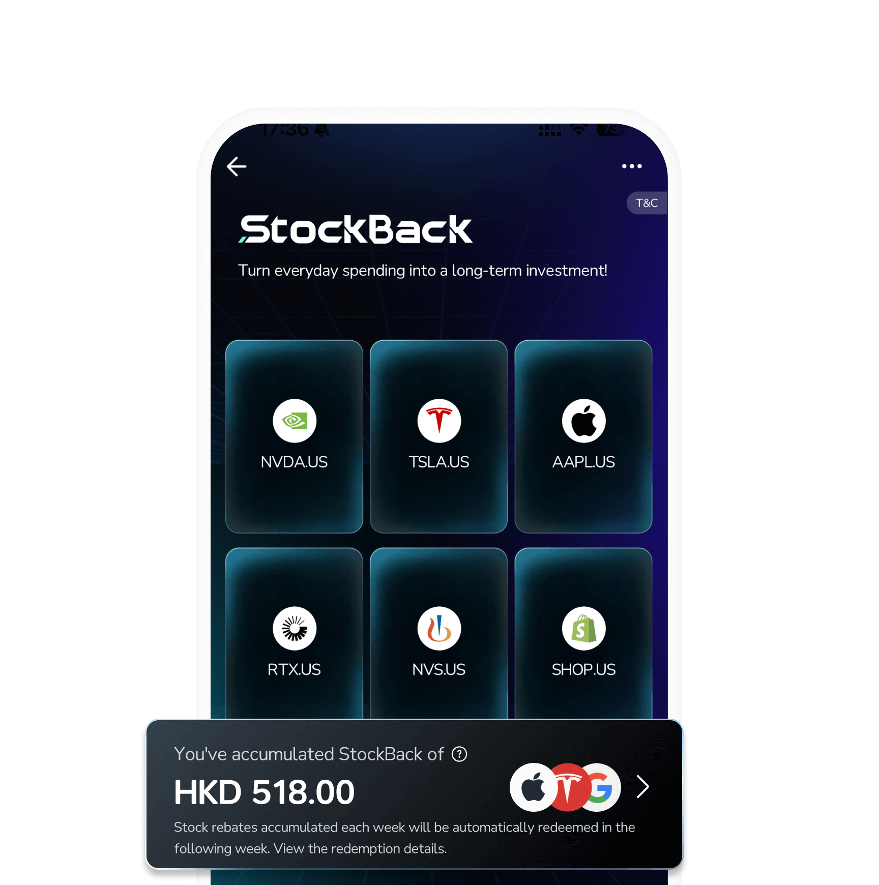 1. “StockBack x ZA Card” Promotion: The promotion period is from 3 November 2025 to 31 March 2026, both dates inclusive. Each eligible transaction with the transaction amount of not less than HKD 10 by participants who use ZA Card with the savings account balance to spend during the promotion period will be entitled to one (1) StockBack Chance, and will not be entitled to any rewards of other ZA Card promotions that involve ZA Coin. All StockBack Chances will be valid for 48 hours. For each StockBack Chance, participants can select one of the six (6) stocks on the StockBack machine on the campaign page as their stock rebate (“StockBack Rewards”), and the amount of reward will be 1% of the transaction amount or a higher rebate amount under limited-time promotions launched by ZA Bank from time to time. Participants must hold a valid investment account and have activated the corresponding investment trading services within 90 calendar days after selecting the StockBack Rewards in order to obtain ownership of and receive the rewards. Otherwise, the rewards will be forfeited and deemed as waived, and ZA Bank will not reissue the rewards. “StockBack x ZA Card”Promotion is subject to its