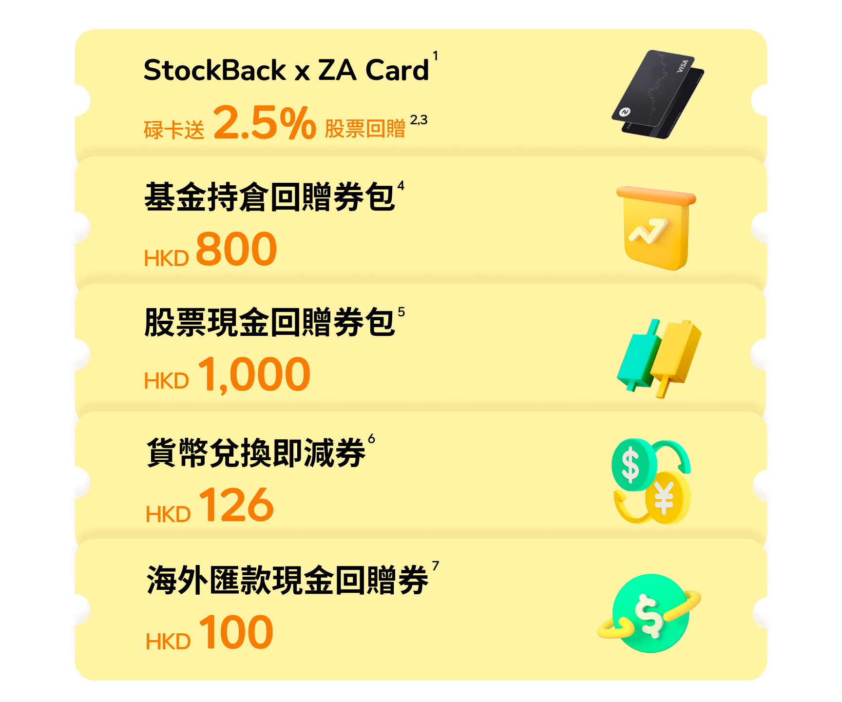 3. 「StockBack x ZA Card」新人禮活動 ﹕推廣期為 2026 年 2 月 13 日至 2026 年 6 月 30 日(包含首尾兩日)。於推廣期內,未曾於 ZA Bank 開立銀行賬戶,以及未曾持有任何 ZA Bank 的產品或服務(包括但不限於存款賬戶、貸款賬戶)的新用戶在成功開戶後的 30 天內(開戶當日計算第一天),選擇「StockBack x ZA Card」回贈計劃並使用 ZA Card 所作的首 HKD 10,000 合資格簽賬交易,可享額外 1% 的股票回贈獎賞。此優惠可與 1.5% 股票回贈之優惠疊加使用,即新用戶最高可享 2.5% 的股票回贈獎賞。「StockBack x ZA Card」新人禮活動受條款及細則約束。