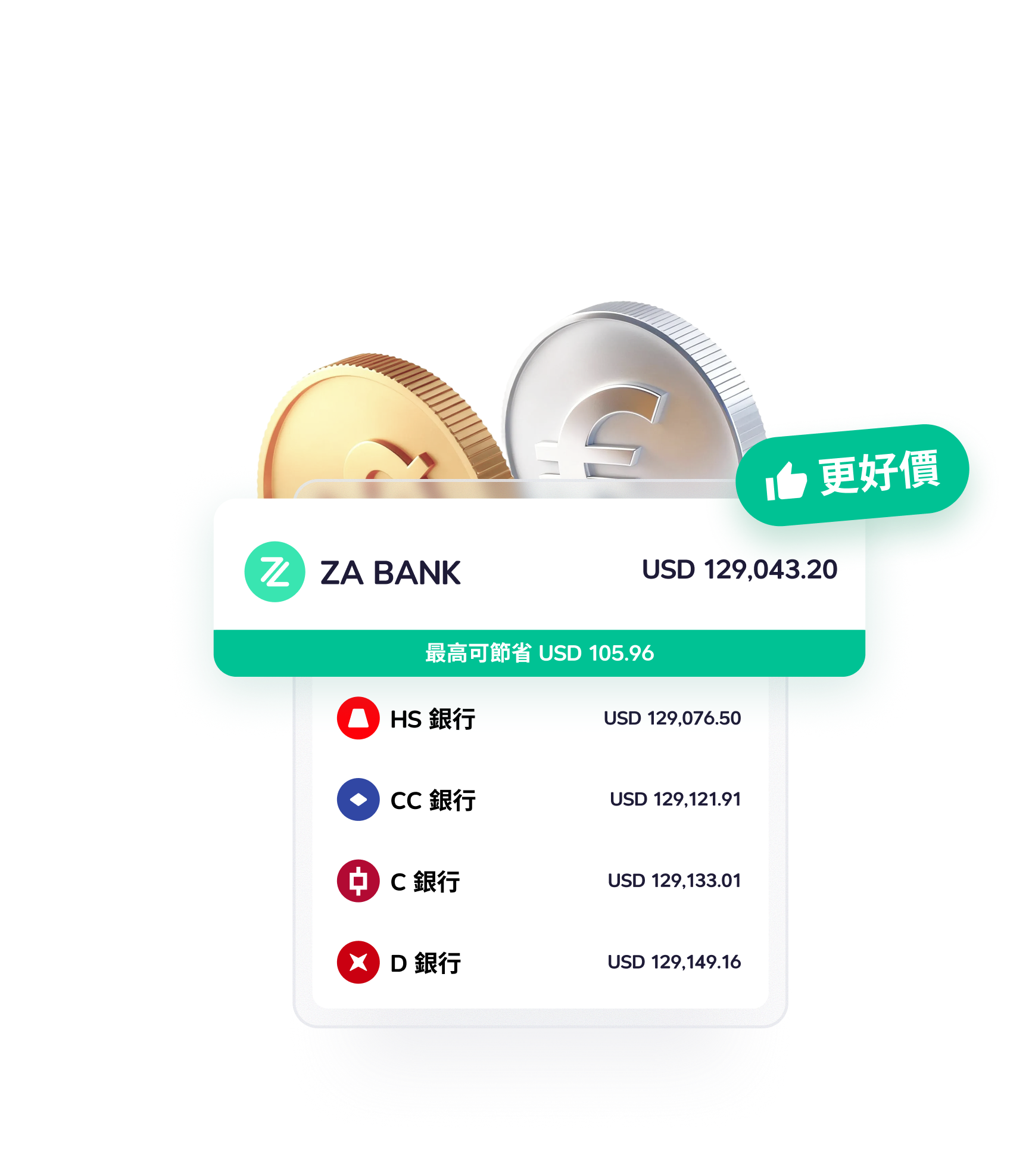 % 匯率僅供參考及只會在香港工作日展示。你可以在其他銀行的網站或應用程式查看實際匯率,以進行更準確的比較。你不應只根據比價表進行外匯交易。我們概不會就你基於任何理由使用這比價表所作之任何用途而承擔任何責任或法律責任。ZA Bank 可以決定隨時修訂或停止相關服務而不需要另行通知。