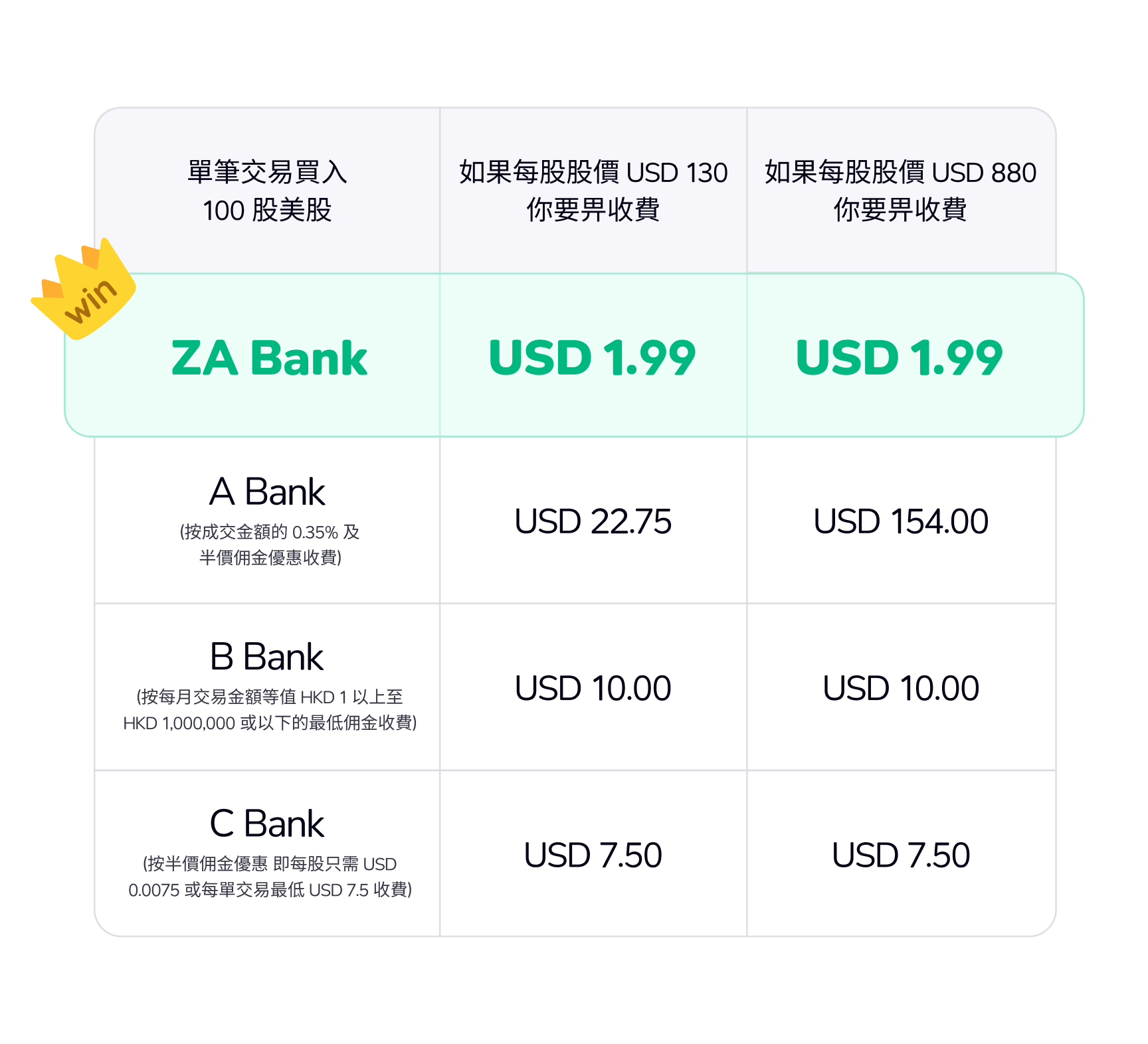 2. 其他銀行的佣金是基於 11 家香港銀行美股佣金收費的平均數計算得出,最後更新日期為 2024 年 2 月 20 日。