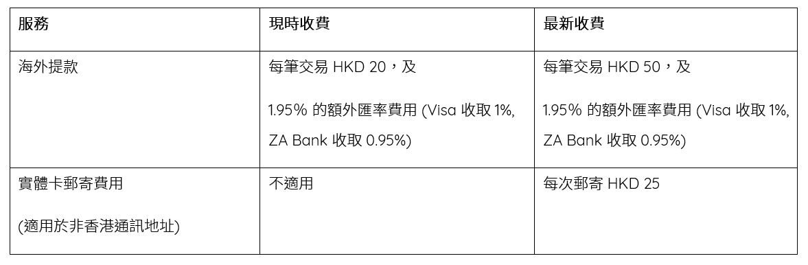 由 2023 年 6 月 1 日起,有關 ZA Card 服務收費簡介的修改內容: