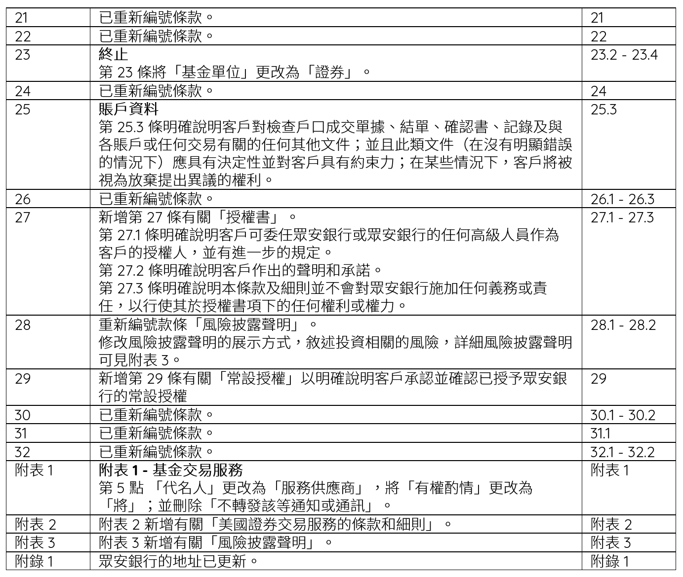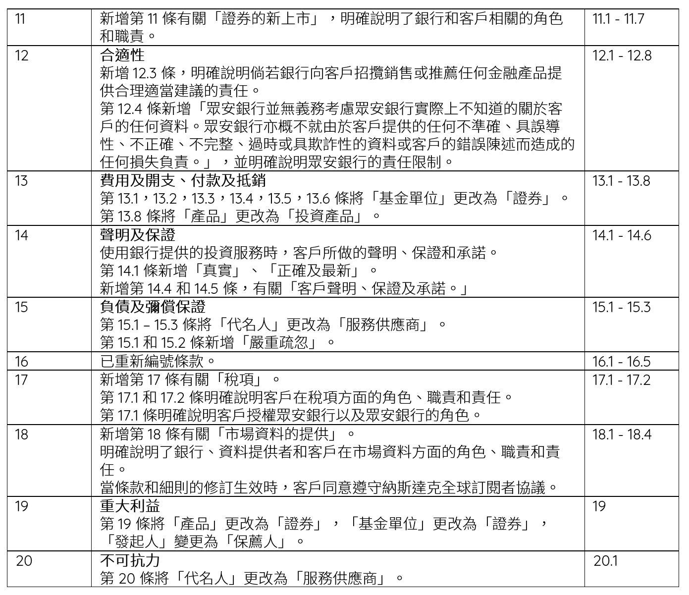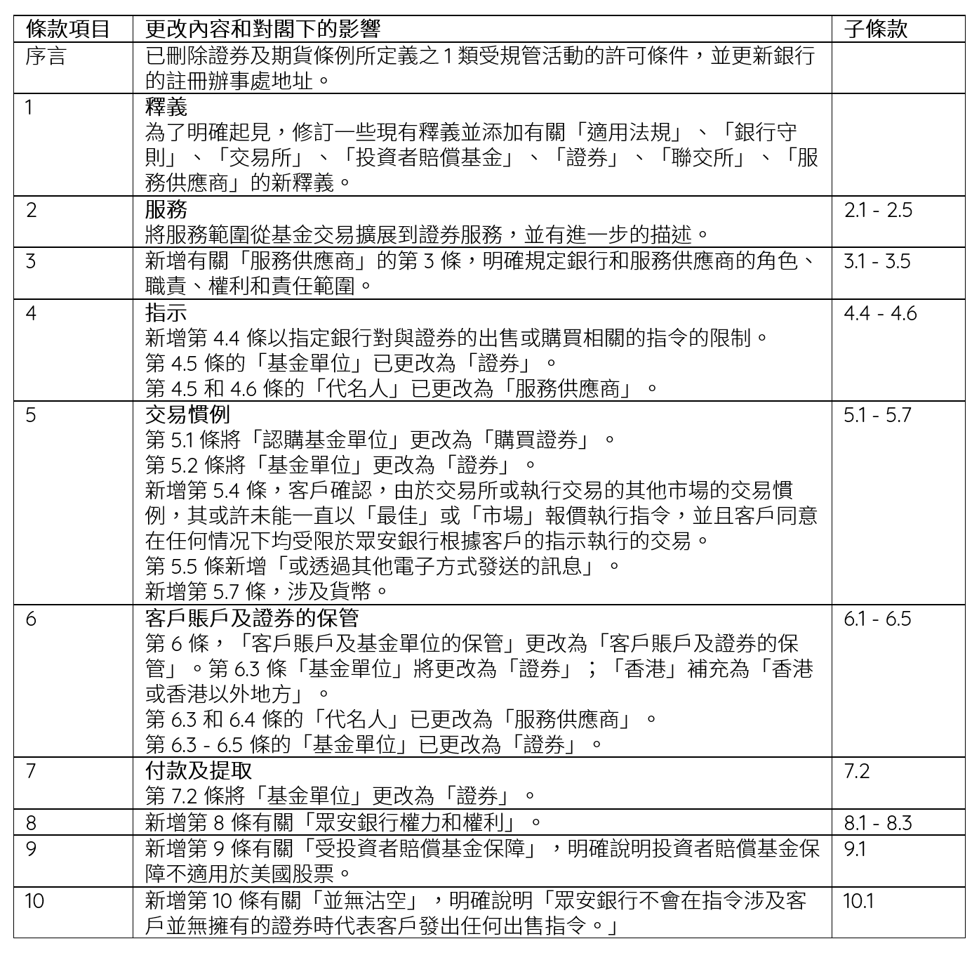 眾安銀行有限公司(「我們」或「眾安銀行」)將更新現有「投資服務條款及細則」(下稱「新修訂條款」),由 2024 年 2 月 19 日起生效。我們知道這可能聽起來很無聊,但為了更好地保護閣下的利益,請耐心閱讀本通知。