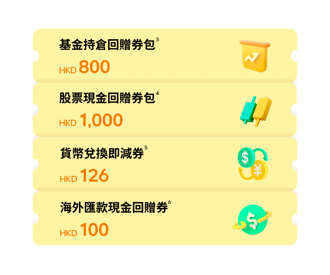 3. 基金持倉回贈券包包括 HKD 780 和 HKD 20 基金持倉回贈券各 1 張,在收到後 30 天內有效,有關基金持倉回贈券之詳情請參閱活動