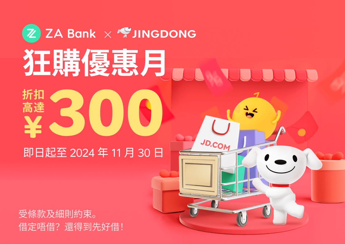 1.「ZA Bank x 京東狂購優惠月」推廣活動:活動推廣期為 2024 年 11 月 1 日起至 2024 年 11 月 30 日(包括首尾兩天)。活動共分為四部分,第一部分為「京東新用戶優惠」,第二部分為「ZA Card 優惠」,第三部分「京東 x ZA Quest優惠」和第四部分為「京東 x 最勁抽優惠」。所有優惠僅限部分京東自營商品,不適用於京東國際及百億補貼的商品。推廣活動受其