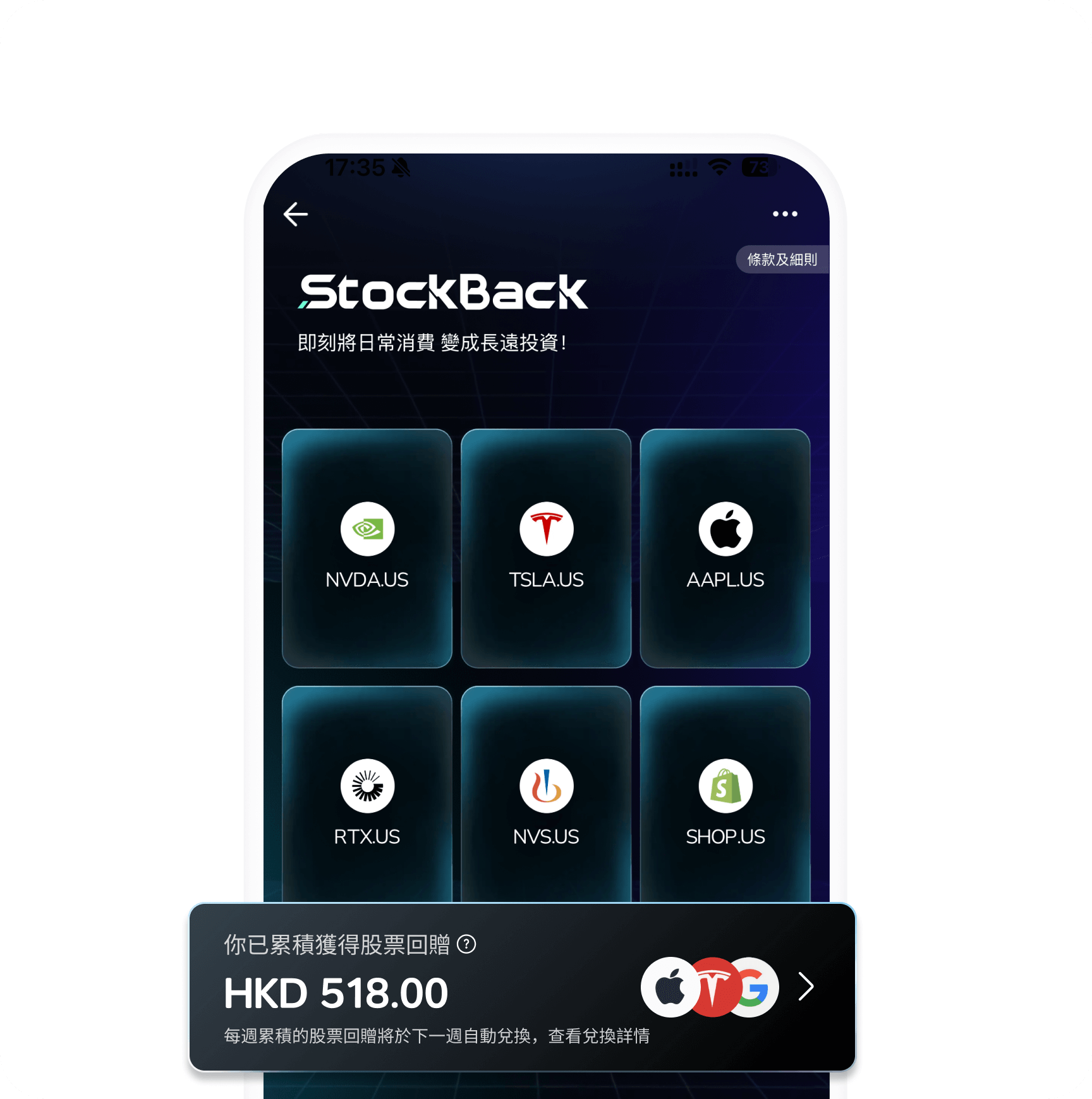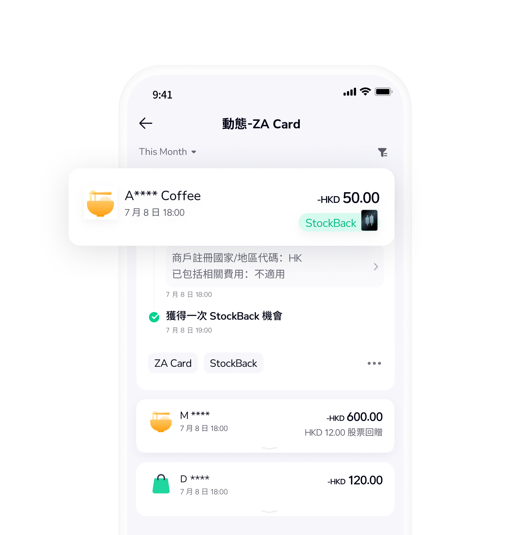 StockBack x ZA Card1 是全港首創以股票作為消費回贈的回贈計劃。每次你用 ZA Card 消費,都可以得到真實的股票作為回贈,定期自動兌換並存入你的投資戶口,沒有任何兌換費用或後續交易費用。你更可以自選 3 隻美股,打造專屬回贈組合,更有機會獲得港股作驚喜奬賞