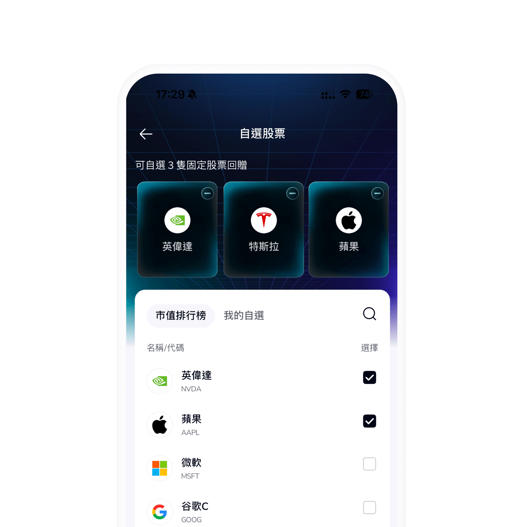打造回贈組合:從美股列表4(如 AAPL、TSLA 及 NVDA 等)中,揀選 3 隻股票作為回贈組合中的股票。